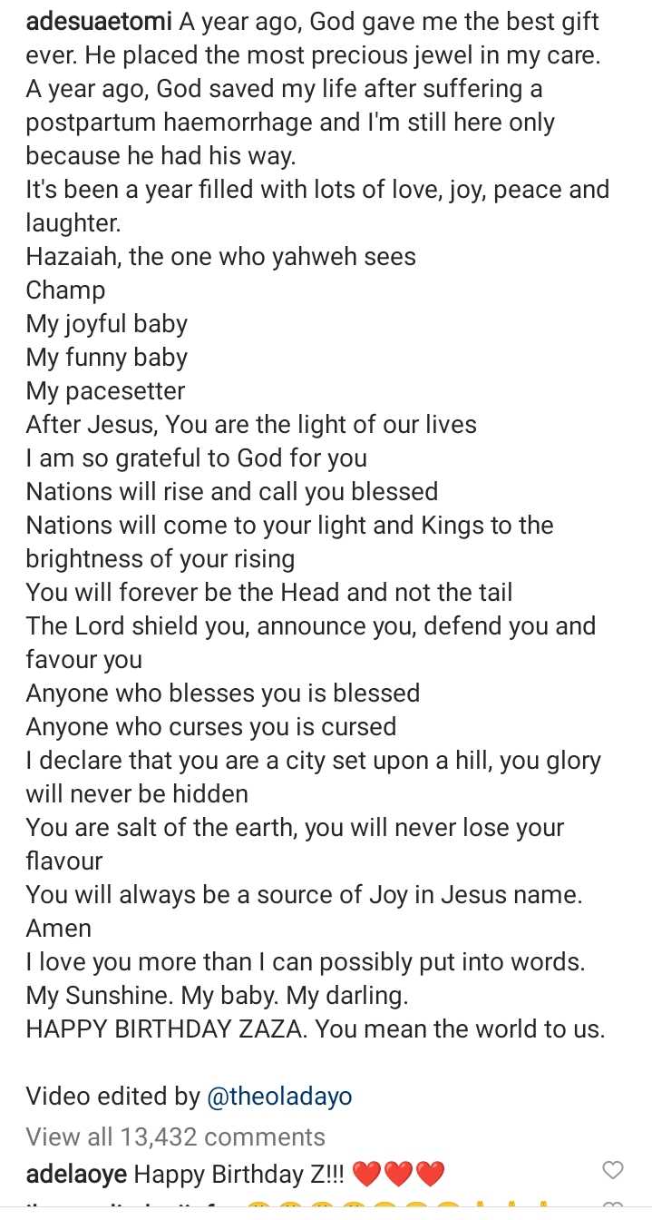 “God saved my life after suffering a postpartum haemorrhage” – Adesua Etomi-Wellington reveals as she celebrates her son’s first birthday (Video)