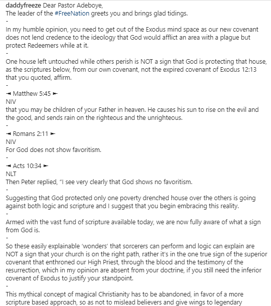 Addressing the part of Adeboye’s response that speaks about Egyptians and the plague, Freeze insinuated that if Nigeria were Egypt and what we’re going through is a plague, then Adeboye is one of those who “installed” the leader we currently have.