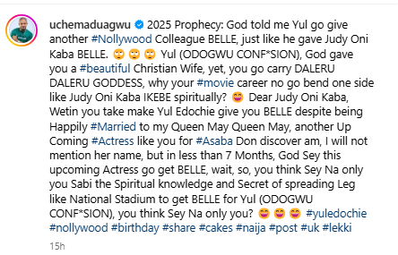“2025 Prophecy: God told me Yul go give another #Nollywood Colleague BELLE, just like he gave Judy Oni Kaba BELLE. 🙄🙄🙄 Yul (ODOGWU CONF*SION), God gave you a #beautiful Christian Wife, yet, you go carry DALERU DALERU GODDESS, why your #movie career no go bend one side like Judy Oni Kaba IKEBE spiritually? 😄 Dear Judy Oni Kaba, Wetin you take make Yul Edochie give you BELLE despite being Happily #Married to my Queen May Queen May, another Up Coming #Actress like you for #Asaba Don discover am, I will not mention her name, but in less than 7 Months, God Sey this upcoming Actress go get BELLE, wait, so, you think Sey Na only you Sabi the Spiritual knowledge and Secret of spreading Leg like National Stadium to get BELLE for Yul (ODOGWU CONF*SION), you think Sey Na only you? 😄😄😄”