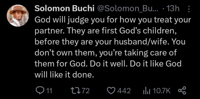 Solomon Buchi wrote: “God will judge you for how you treat your partner. They are first God’s children, before they are your husband/wife. You don’t own them, you’re taking care of them for God. Do it well. Do it like God will like it done.
