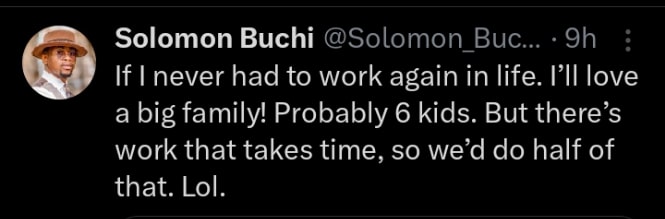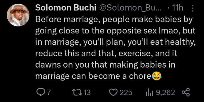 “Before marriage, people make babies by going close to the opposite sex Imao, but in marriage, you’ll plan, you’ll eat healthy, reduce this and that, exercise, and it dawns on you that making babies in marriage can become a chore.
