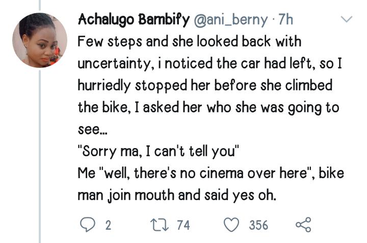 “Few steps and she looked back with uncertainty, I noticed the car had left, so I hurriedly stopped her before she climbed the bike. I asked her who she was going to see.