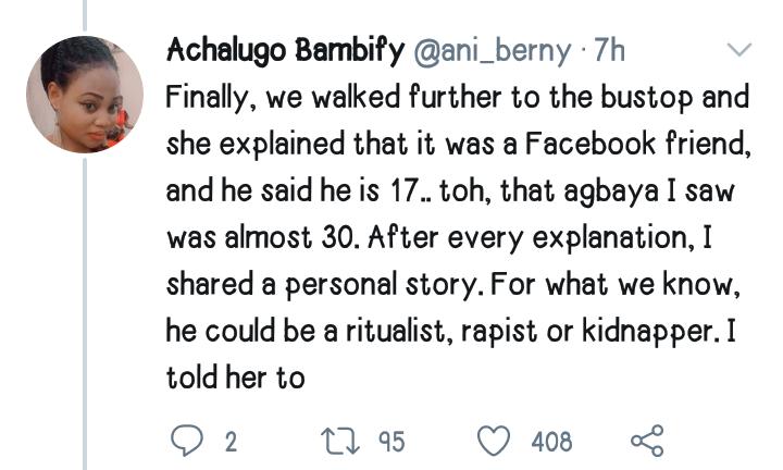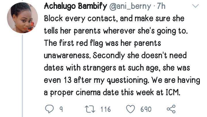 “Finally, we walked further to the bus stop and she explained that it was a Facebook friend and he said he is 17..toh, that agbaya I saw was almost 30. After every explanation, I shared a personal story. For what we know, he could be a ritualist, rapist or kidnapper. I told her to block every contact, and make sure she tells her parents wherever she’s going to. The first red flag was her parents unawareness. Secondly she doesn’t need dates with strangers at such age, she was even 13 after my questioning. We are having a proper cinema date this week at ICM.”