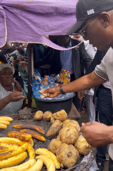 Lagos State Governor, Babajide Sanwo-Olu, has caused a buzz online as he was spotted buying roasted plantain (Boli) from a roadside vendor after conducting an inspection along the Lagos-Ibadan expressway.