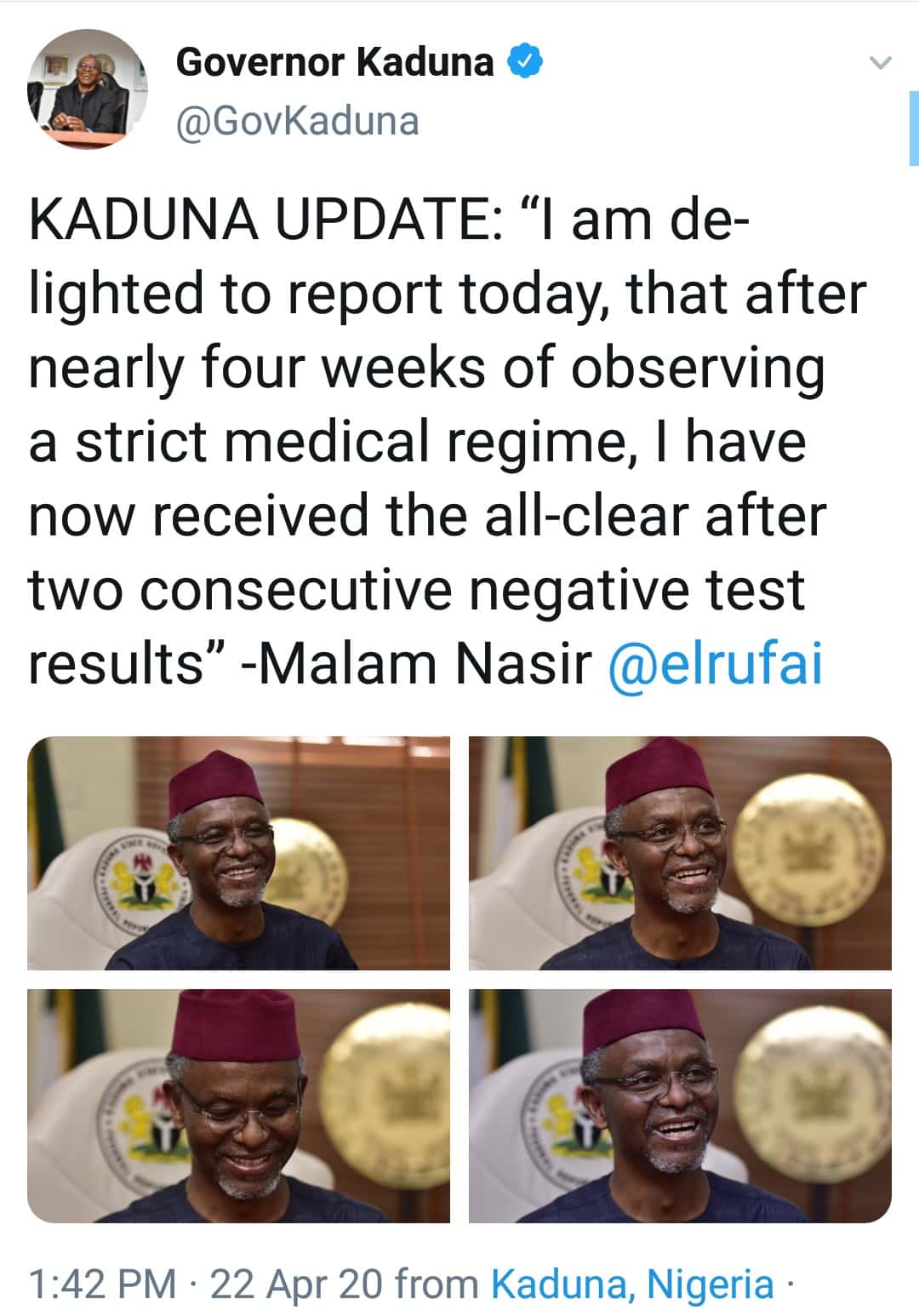 Governor of Kaduna State, Mallam El Rufai has tested negative to covid-19 after weeks of treatment.