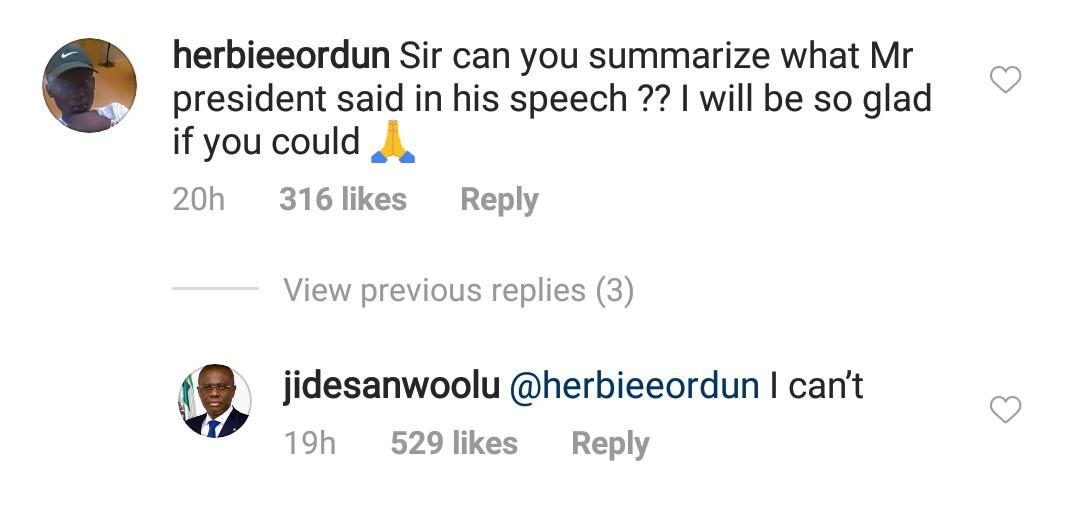 Recall, Nigeria’s president, Muhammadu Buhari addressed the Nation yesterday, and the man who couldn’t comprehend the message, took to Gov. Sanwo-Olu’s Instagram page, to ask for clarification.