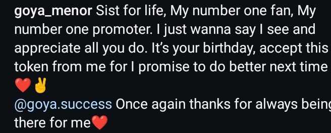 “@goya.success Once again thanks for always being there for me❤️”.