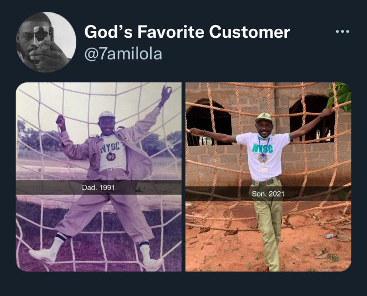 University graduate serving his father’s land recreates the NYSC photography of his dad 30 years later with a striking resemblance.