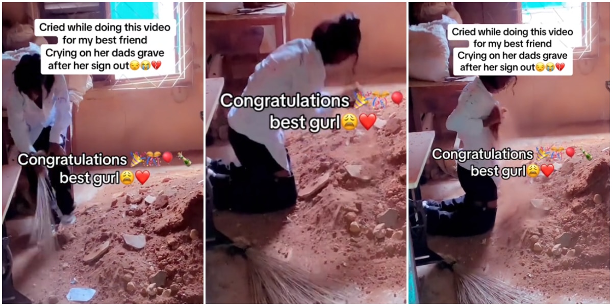 A female graduate paid a tearful visit to her late father’s grave, capturing the emotional moment in a TikTok video that has since gone viral.
