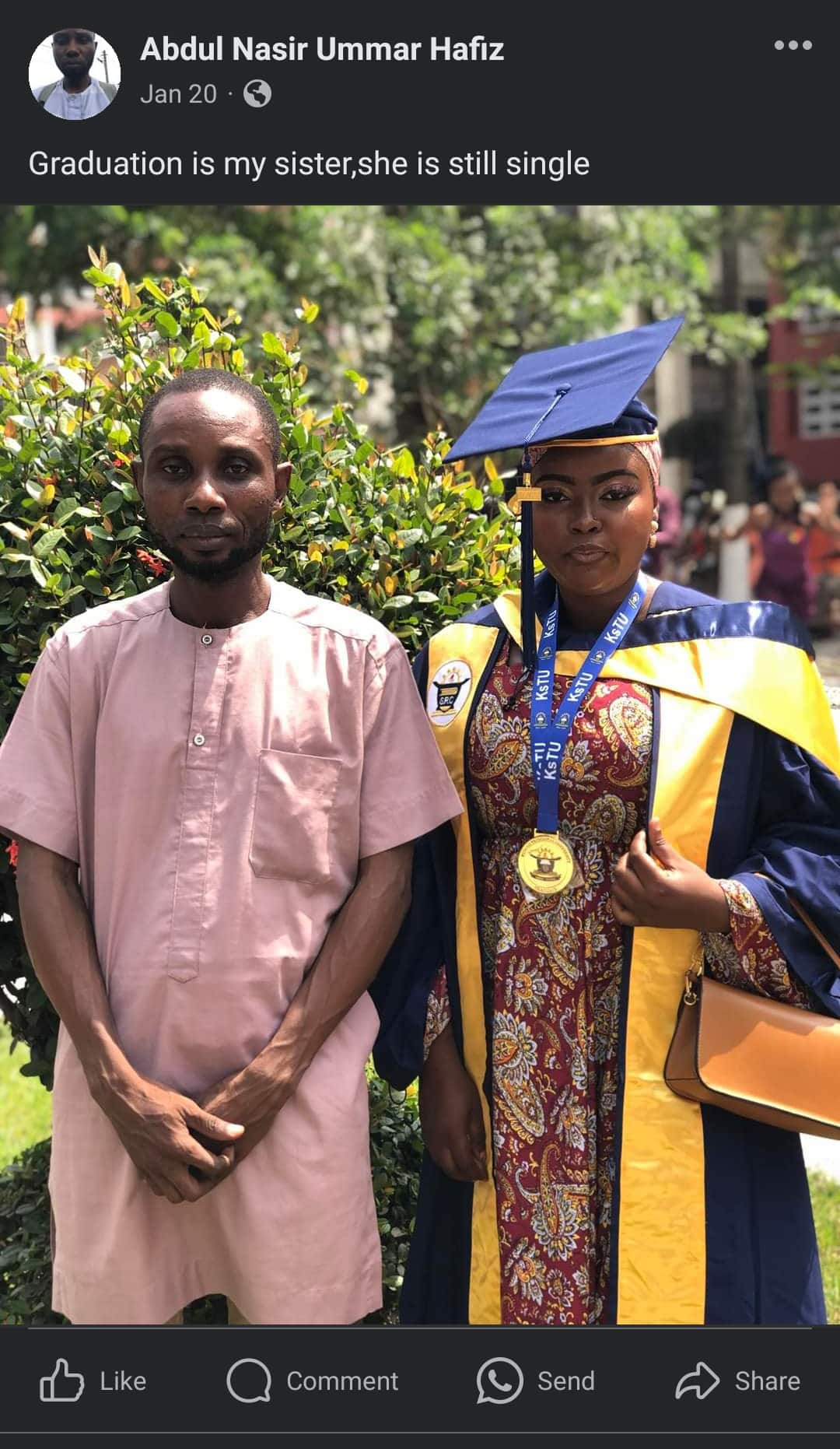 This was contained in a post captioned: “Graduation is my sister; she is still single.”