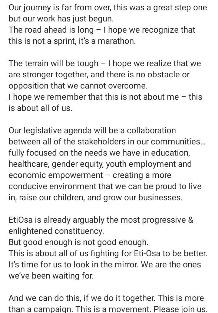Following his victory, the singer cum politician has taken to his social media page to pen a lengthy message, thanking his friends donors and supporters.