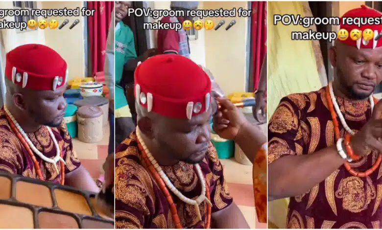 A Nigerian groom has taken social media by storm after a video surfaced online showing him calmly receiving makeup on his wedding day.