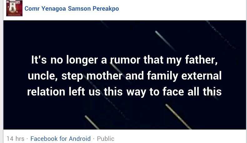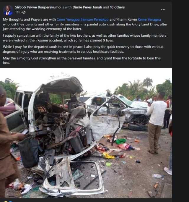 My thoughts and Prayers are with Comr Yenagoa Samson Pereakpo and Pharm Kelvin Keme Yenagoa who lost their parents and other family members in a painful auto crash along the Glory Land Drive, after just attending the wedding ceremony of the latter.