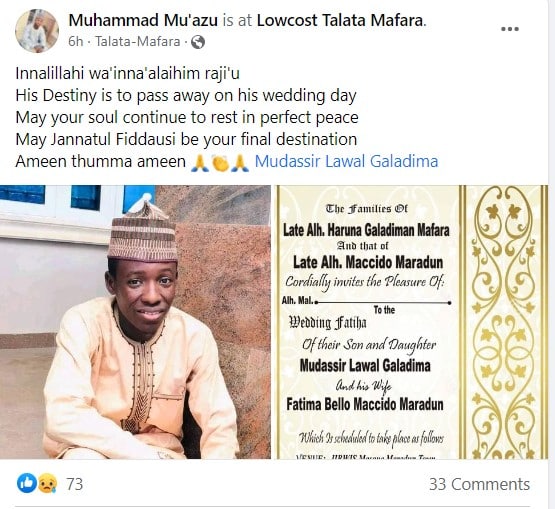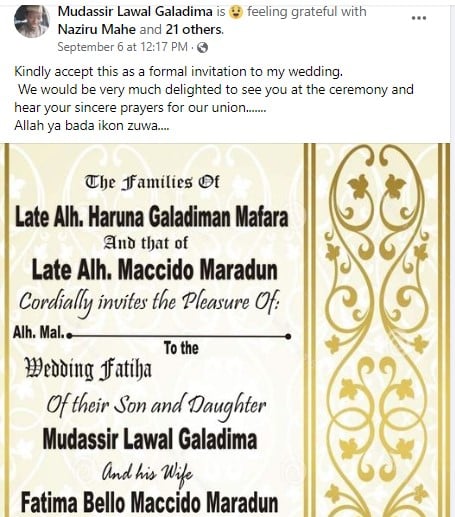 The said groom, who has been identified as Mudassir Lawal Galadima had put an official invite to his wedding 2 days ago on Facebook, asking that friends and family join him to celebrate.