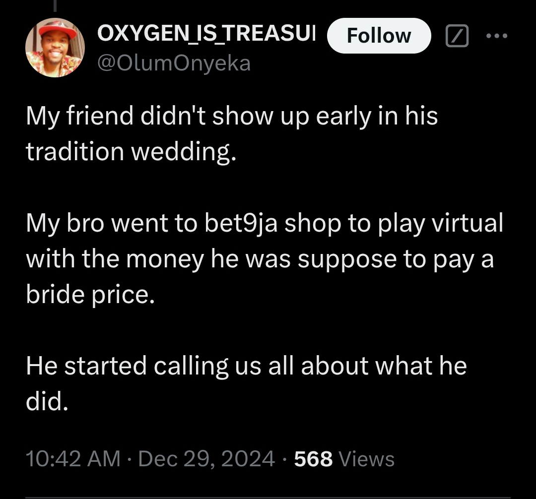 In a viral post shared on X (formerly Twitter), the man narrated that his friend, who was supposed to be at his traditional wedding, instead stormed a Bet9ja shop and used the bride price money to play virtual bets while the bride waited.