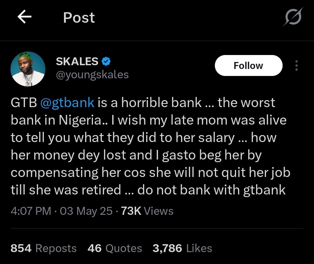In his post, Skales shared a personal experience involving his late mother, claiming that GTBank had frequently made unauthorized deductions from her salary account.