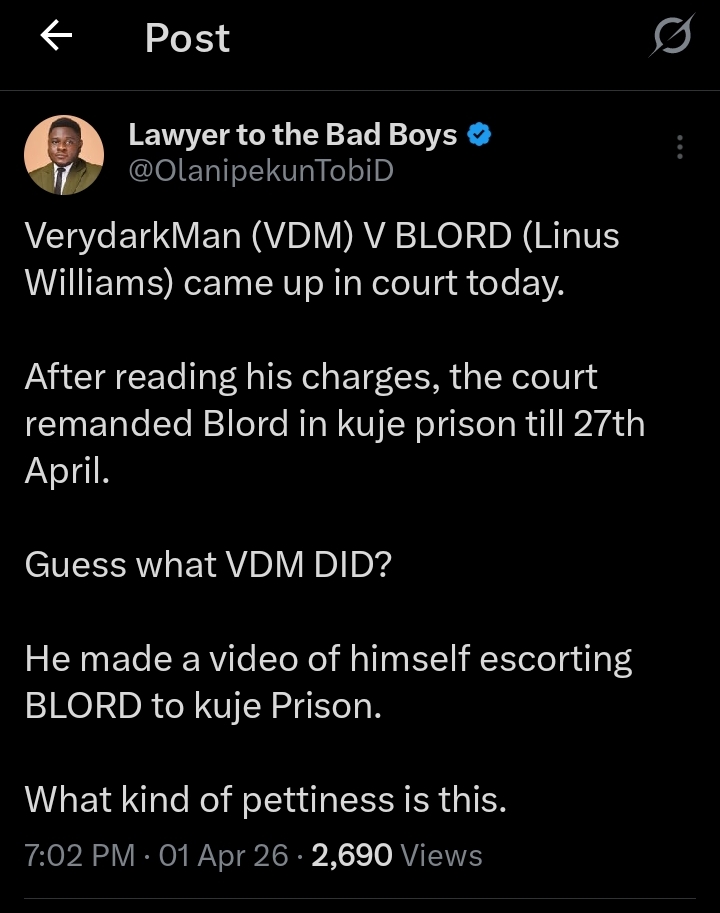 It would be recalled that Blord was arrested and remanded in Kuje Prison on April 1, 2026, for allegedly impersonating VeryDarkMan.