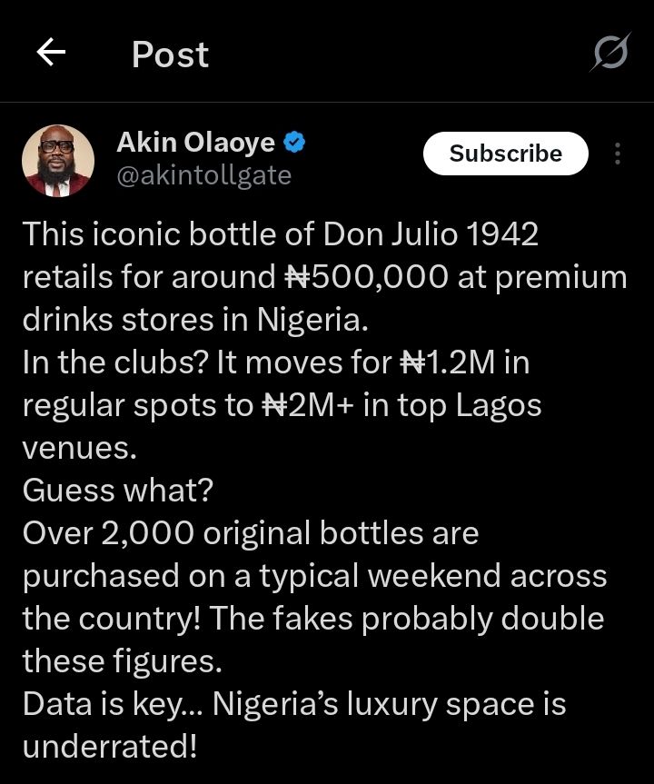 ”Over 2,000 original bottles are purchased on a typical weekend across the country! The fakes probably double these figures. Data is key.Nigeria’s luxury space is underrated”, The tweet reads in part.