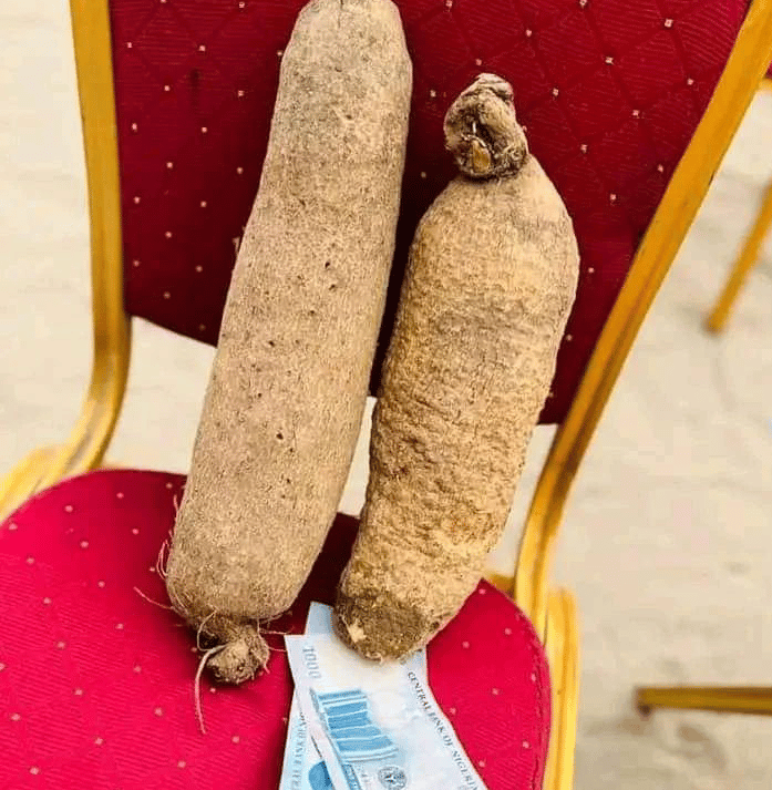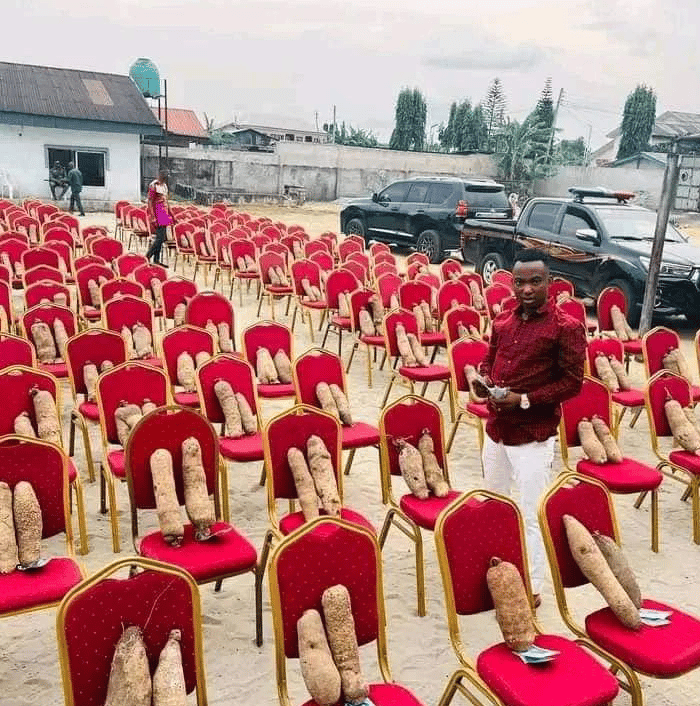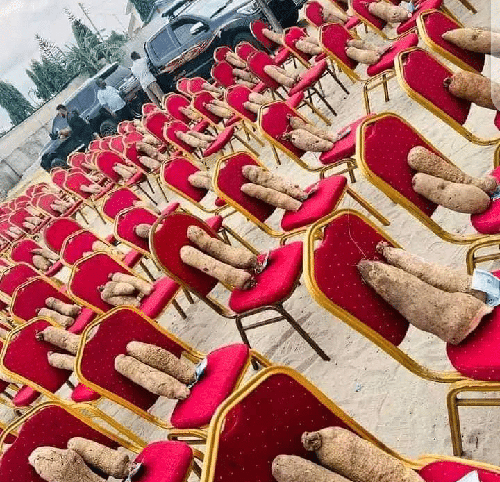 In the photos making the rounds online, the chairs at the venue were carefully arranged and two tubers of yam together with new naira notes were spotted on the chairs.