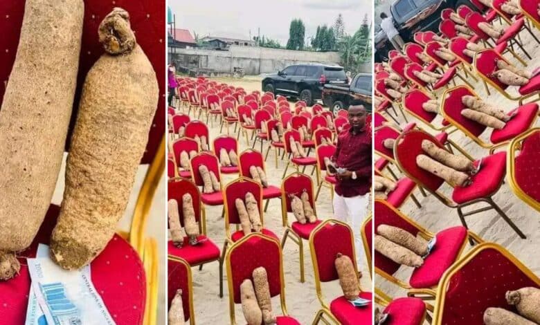 In the photos making the rounds online, the chairs at the venue were carefully arranged and two tubers of yam together with new naira notes were spotted on the chairs.