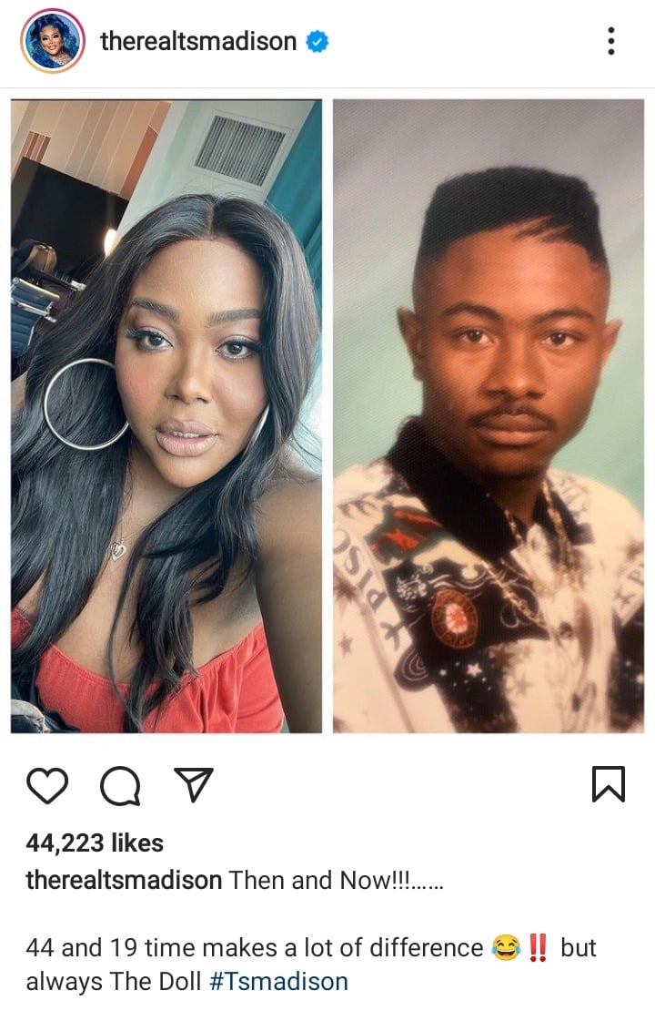 “Guys, always ask for baby pictures” – Netizens react as American actress, Ts Madison shares before and after picture