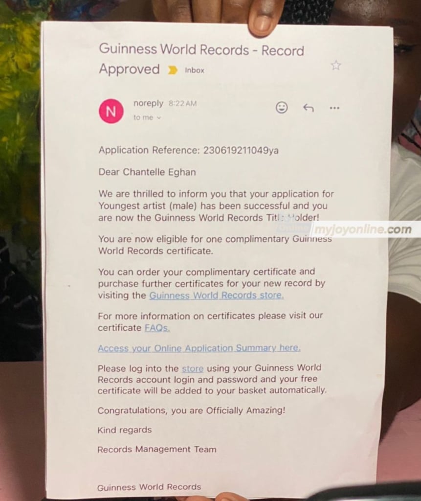 The online confirmation letter said: “We are thrilled to inform you that your application for Youngest Artist (male) has been successful, and you are now the Guinness World Records Title Holder!”