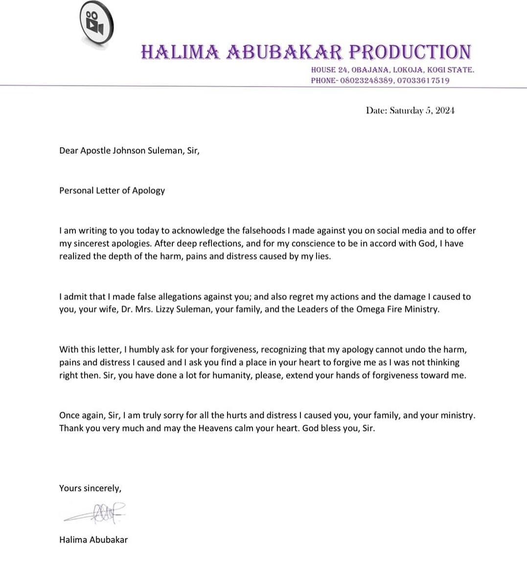Nollywood actress Halima Abubakar has issued an apology to Apostle Johnson Suleman of Omega Fire Ministries for making defamatory statements against him.