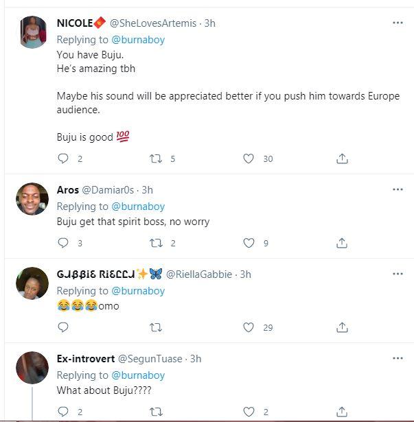 The Grammy Winner, Burna Boy has sparked mixed reactions on social media after he disclosed that he is in search of a young artiste that matches his spirit to hand over to.