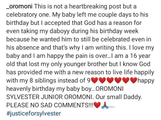 I love my baby and I am happy the pain is over…I am a 16 year old that lost my only younger brother but I know God has provided me with a new reason to live life happily with my 8 siblings instead of 9❤️❤️❤️❤️❤️❤️happy heavenly birthday my baby boy…OROMONI SYLVESTER JUNIOR OROMONI. Our small Daddy. PLEASE NO SAD COMMENTS…I will Delete it?!!!??….#justiceforsylvester”