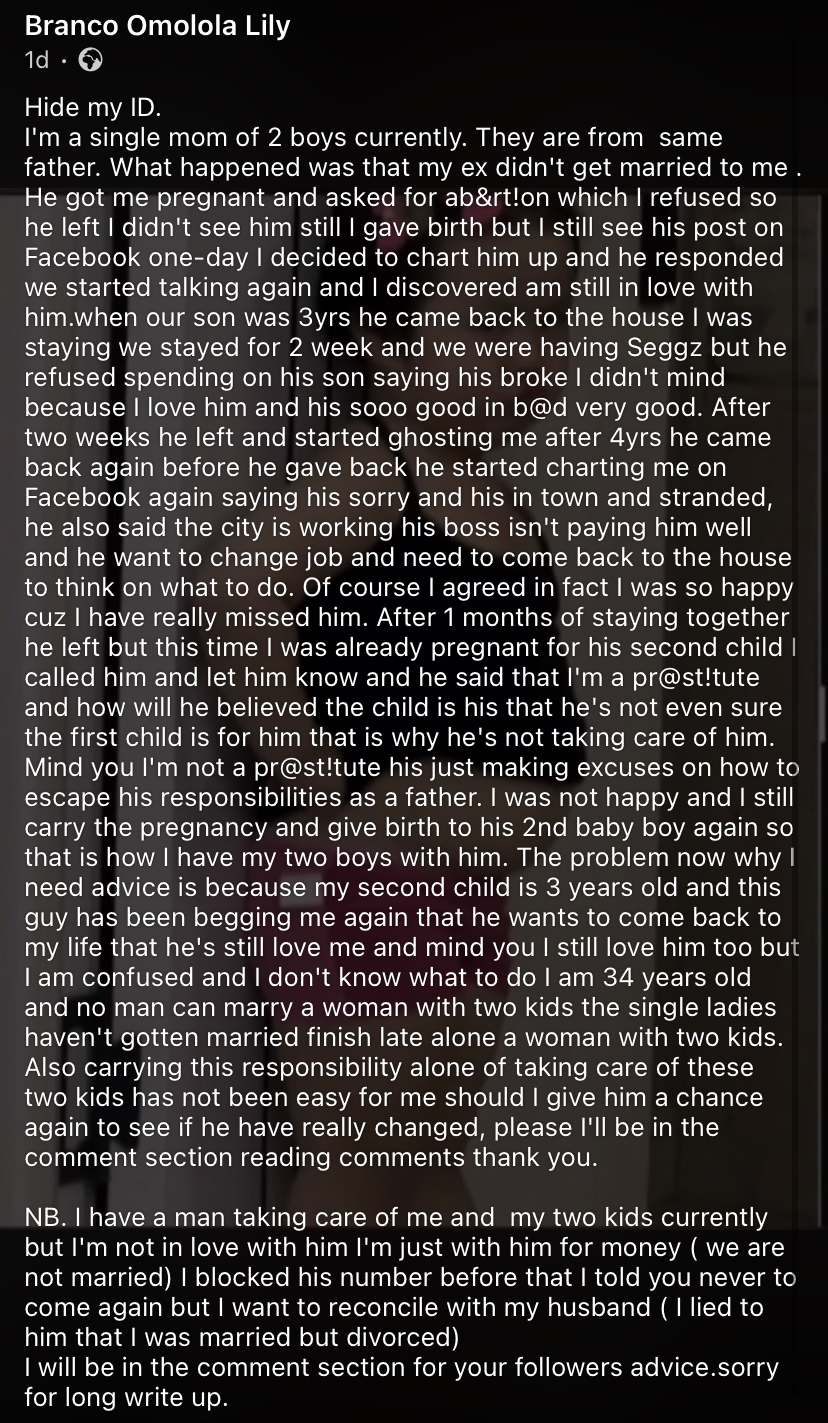 The story was shared on Facebook by Branco Omolola Lily, where the woman opened up about her relationship history, struggles as a single parent, and the confusion she now faces.
