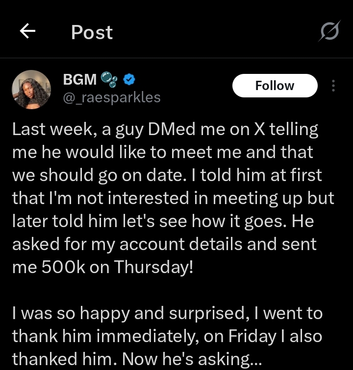 ‎Last week, a guy DMed me on X telling me he would like to meet me and that we should go on date. I told him at first that I’m not interested in meeting up but later told him let’s see how it goes. He asked for my account details and sent me 500k on Thursday.