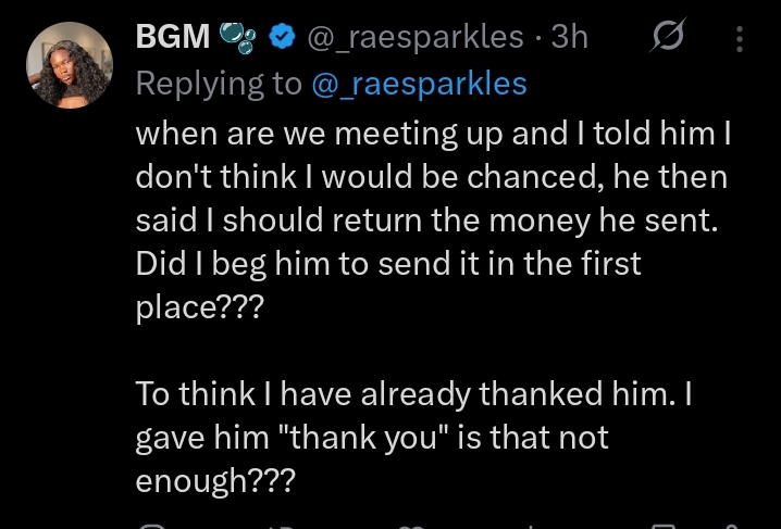 ‎A Nigerian lady on the microblogging platform, X (formerly Twitter) has shared why a man who sent her ₦500,000 requested a refund.