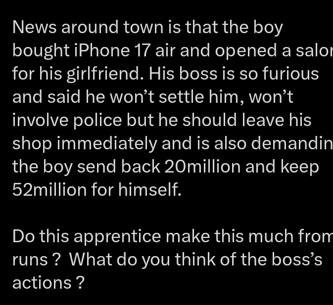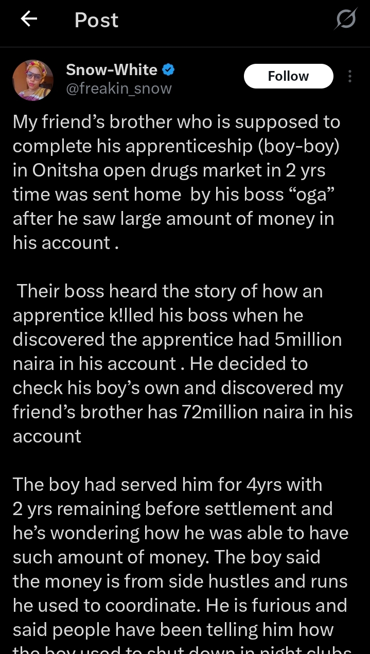 In her tweet, the lady shared that the boss checked his apprentice’s account after learning about an incident where an apprentice assassinated his boss.