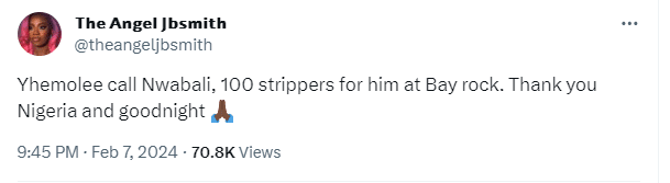 She informed the night life enthusiast, Yhemolee to rally up 100 strriippeers for Nwabali at Bay Rock.