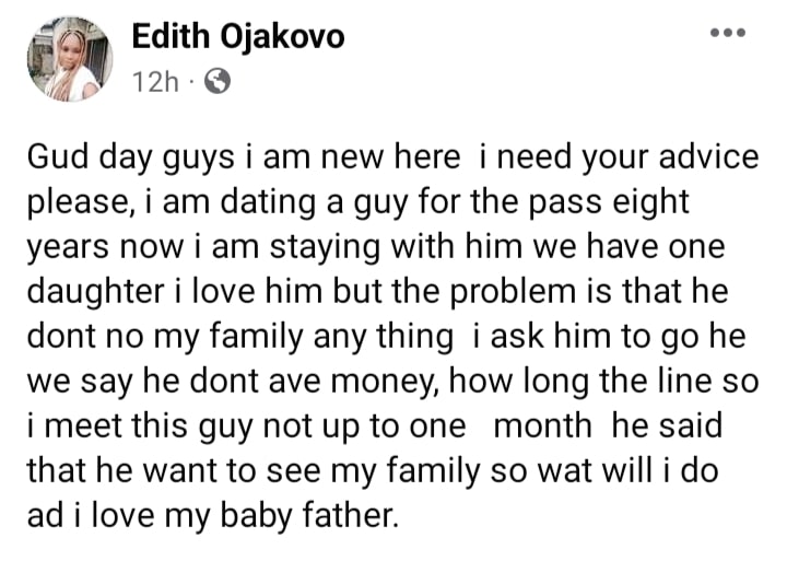 The woman, who has been dating her partner for eight years and shares a child with him, is frustrated that he is yet to meet her family.
