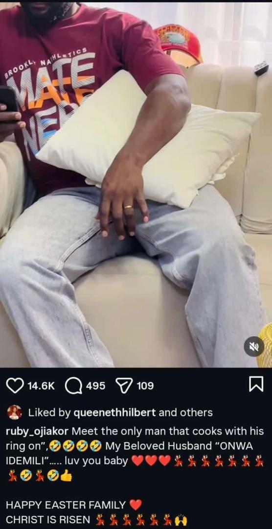 “Meet the only man that cooks with his ring on… My beloved husband ‘Onwa Idemili’… love you, baby. Happy Easter family, Christ is risen,” she added.