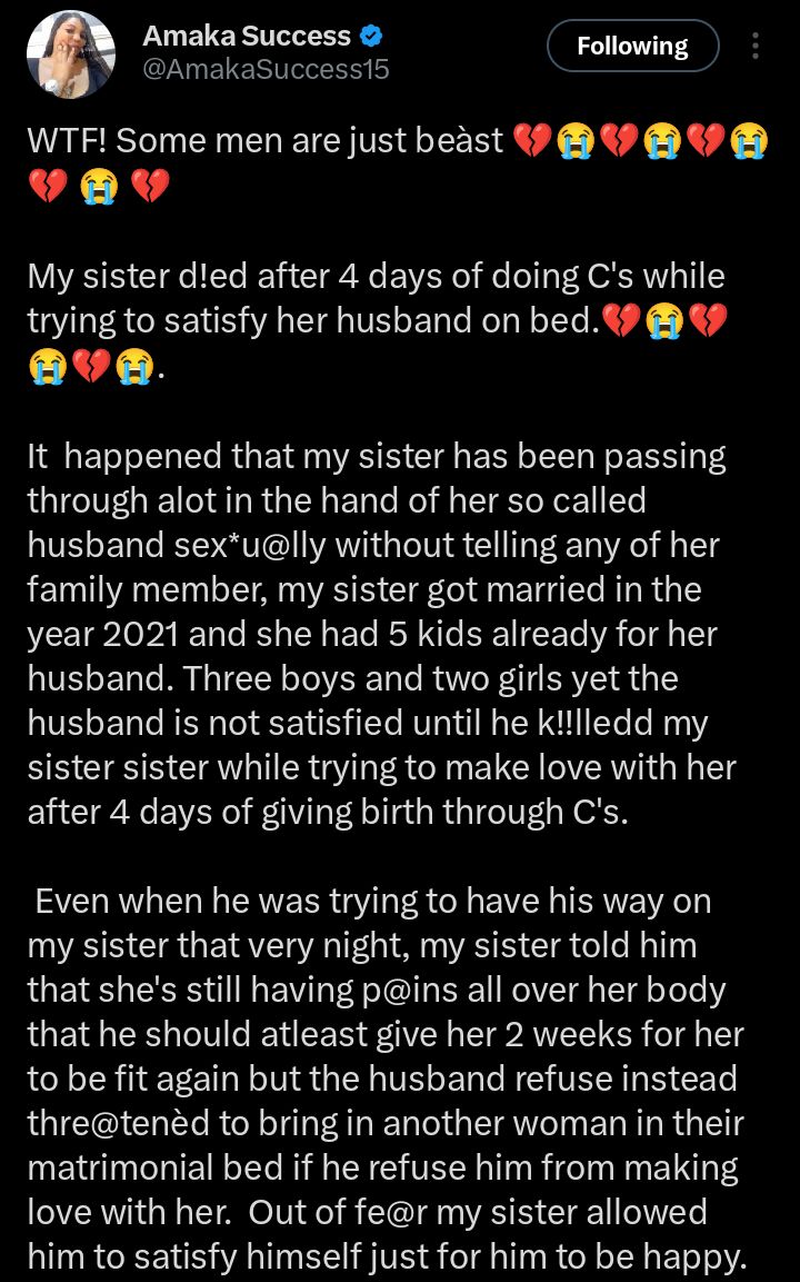 According to the account shared online, the deceased woman underwent a caesarean section and was still in severe pain four days later when her husband allegedly forced her to have sex against medical advice.