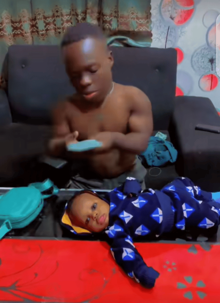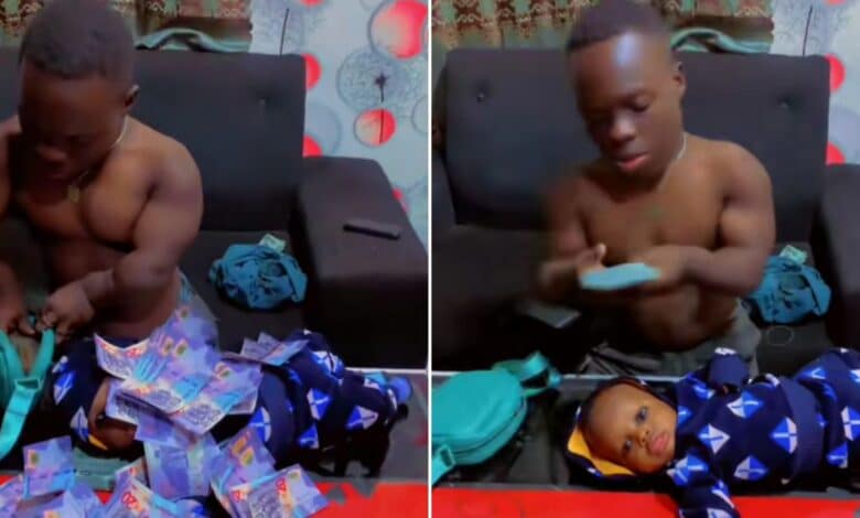 In the video, he lifted his baby’s head and stacked cash underneath. After which, he opened his bag and brought out more cash which he showered on his baby.