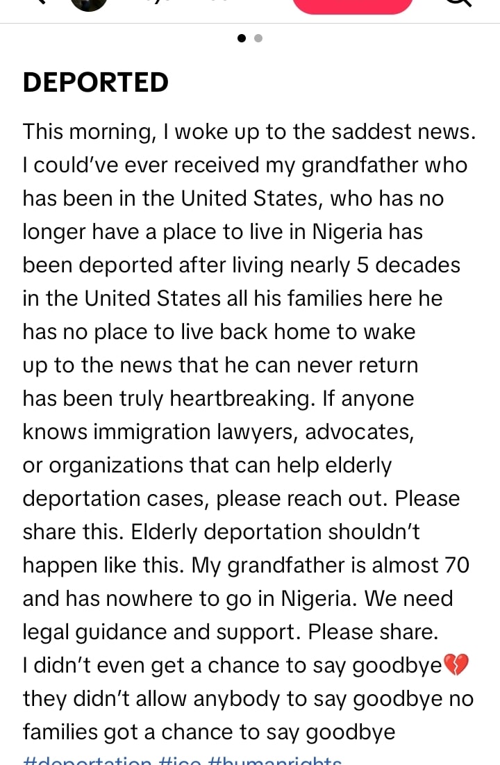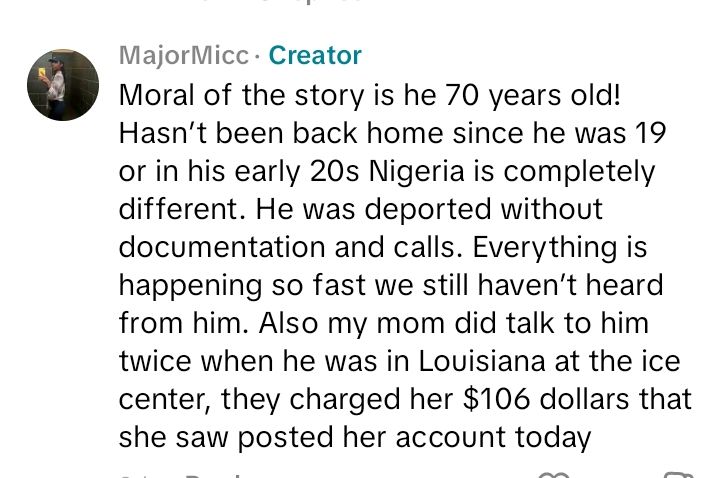 In her post, the granddaughter identifed as @Majormicc on TikTok shared that she is yet to hear from her grandfather, Joe since his deportation.