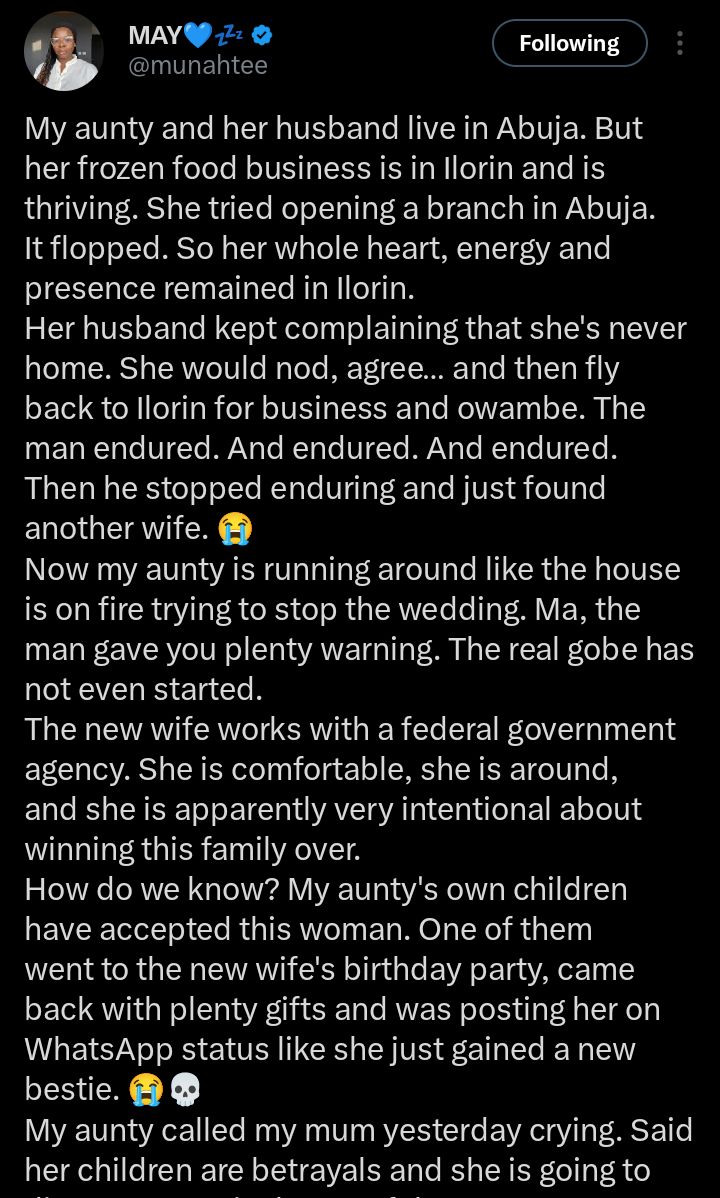 A lady has shared a dramatic account of her aunt’s marital crisis, revealing how prolonged absence due to business commitments allegedly pushed her husband to take another wife.