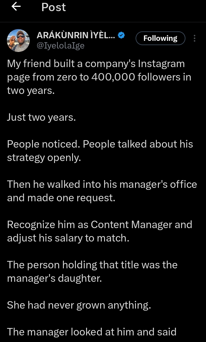 According to @Iyelolage, his friend built the company’s Instagram account over two years, while the incident stemmed from an incident at the manager’s office.