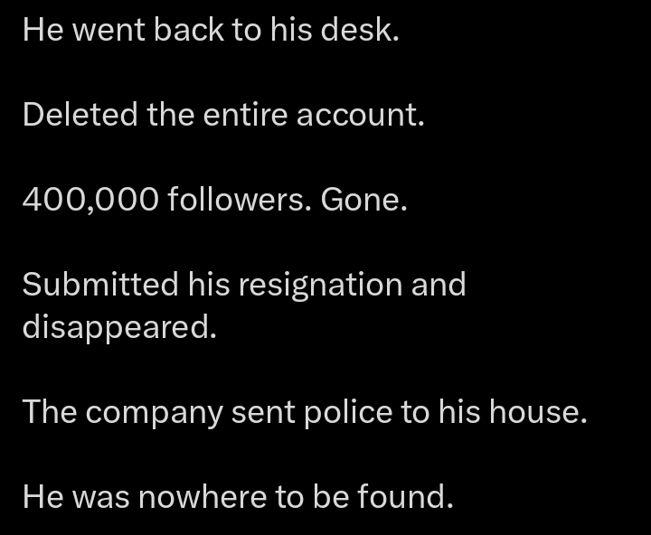 Sharing details of the aftermath, @Iyelolage narrated, “He went back to his desk.Deleted the entire account.400,000 followers. Gone.Submitted his resignation and disappeared.The company sent police to his house.He was nowhere to be found”.