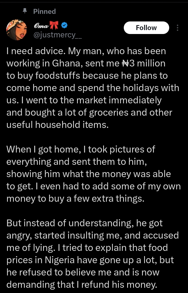 The lady, @justmercy on X (formerly Twitter), shared that her man, who works in Ghana, sent her ₦3 million to purchase food items.