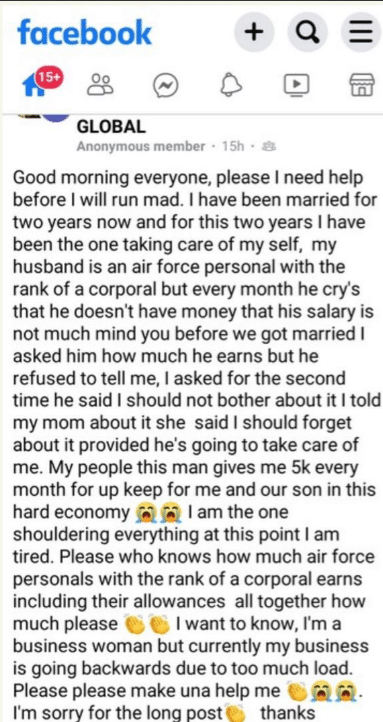 A woman has opened up about her financial struggles as her husband, an Air Force corporal, provides her with a meager monthly allowance of N5000.