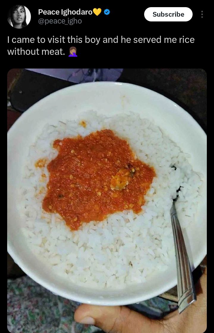 A lady has triggered widespread reactions on social media after lamenting about being served a plate of rice and stew without meat while visiting a male friend.