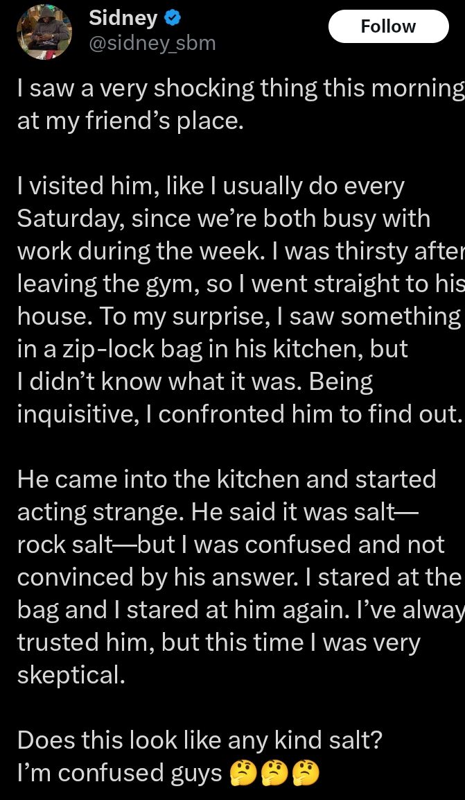 Sharing details of what transpired after the confrontation, @sidney_sbm narrated, “He came into the kitchen and started acting strange. He said it was saltrock salt but I was confused and not convinced by his answer. I stared at the bag and I stared at him again. I’ve always trusted him, but this time I was very skeptical”.