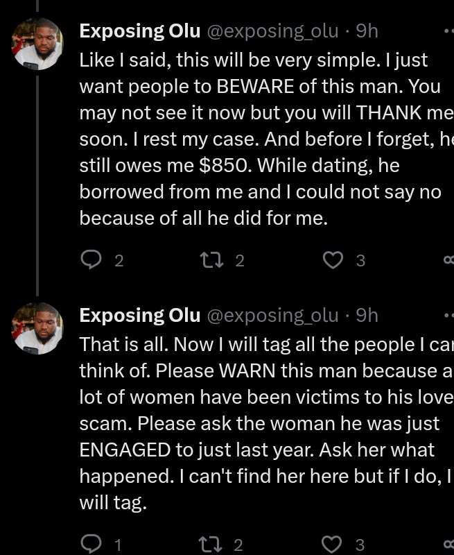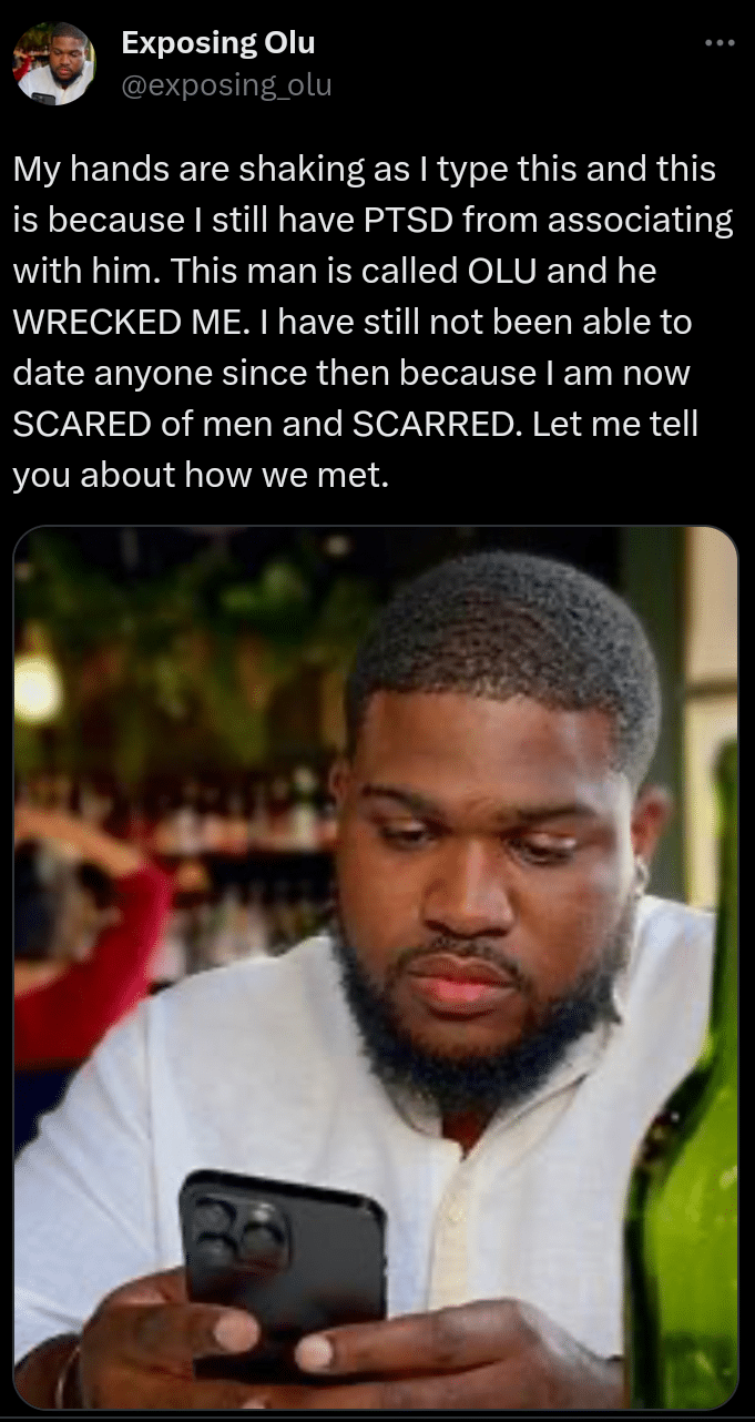 Her statement: “My hands are shaking as I type this and this is because I still have PTSD from associating with him. This man is called OLU and he WRECKED ME. I have still not been able to date anyone since then because I am now SCARED of men and SCARRED. Let me tell you about how we met.”