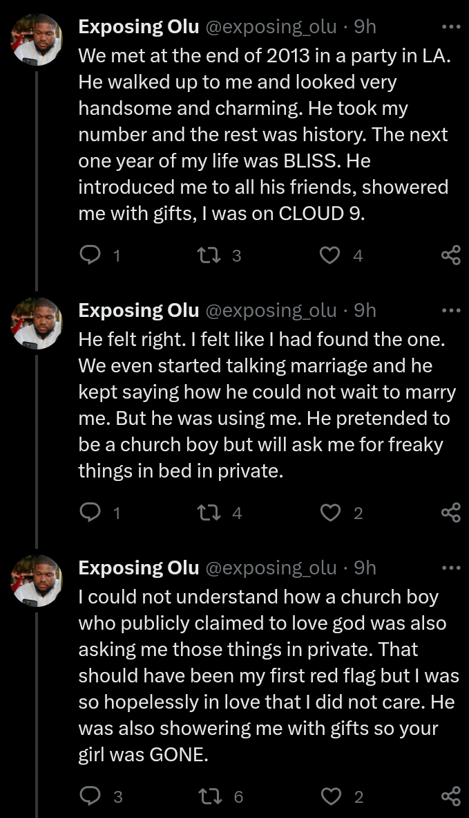 “I could not understand how a church boy who publicly claimed to love god was also asking me those things in private. That should have been my first red flag but I was so hopelessly in love that I did not care. He was also showering me with gifts so your girl was GONE.”