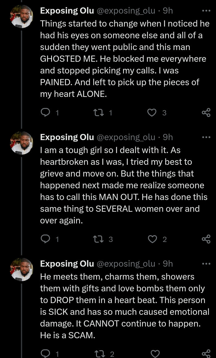 She shared that Olu had initially shown her love, attention, and everything she desired in a partner, but eventually, he ended the relationship and pursued other women.