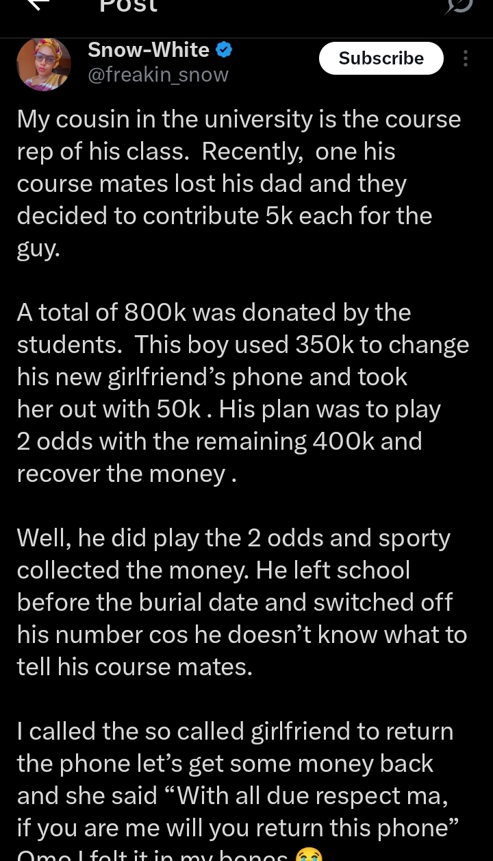 “He switched off”- Lady shares how her cousin spent ₦800K contributed for coursemate’s father’s burial